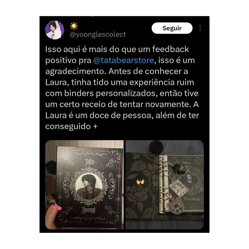 “Isso aqui é mais do que um feedback positivo pra @tatabearstore, isso é um agradescimento. Antes de conhecer a Laura, tinha tido uma experiência ruim com Binder Personalizados, então tive um certo receio de tentar novamente. A Laura é um doce de pessoa, além de ter conseguido +”